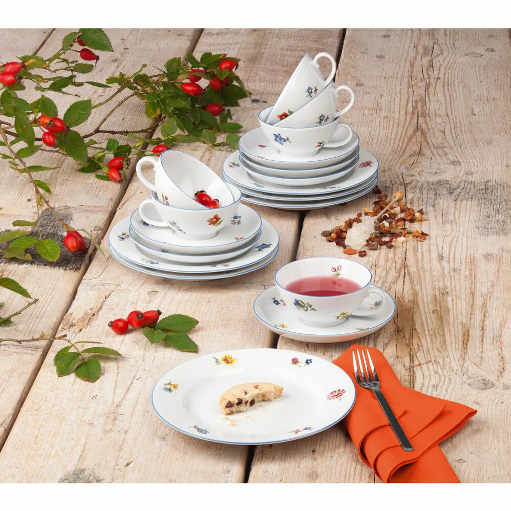 Dieses Set besteht aus:6x Teeobertasse klein 0,14ltr. 6x Teeuntertasse klein 13cm6x Brotteller 17cm1. Wahl, Porzellan, spülmaschinenfest, ofenfest, mikrowellengeeignet.