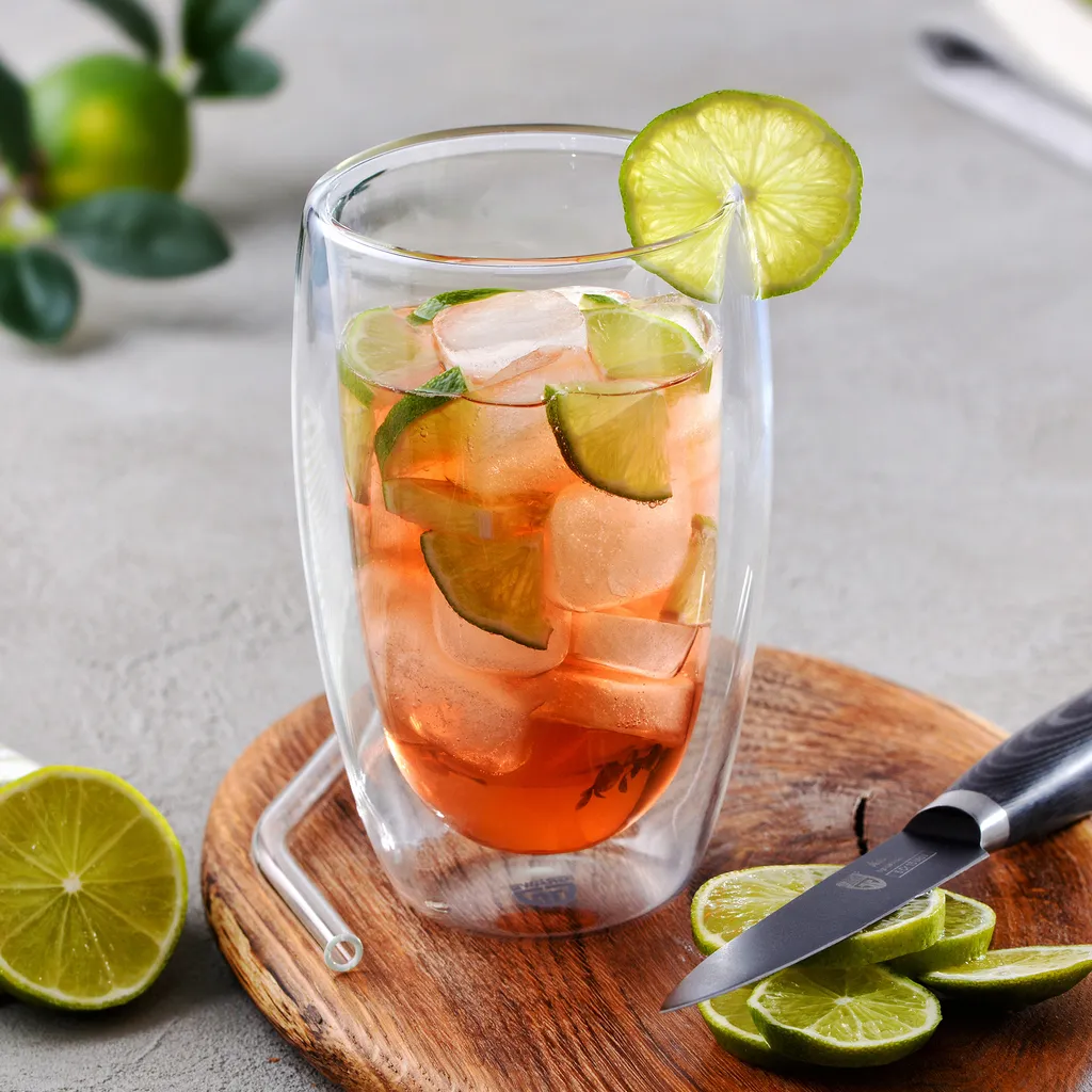 Durch das doppelwandige Borosilikatglas befindet sich zwischen den Glaswänden eine eingeschlossene Luftschicht. Damit entsteht ein isolierender Effekt. So bleiben Heißgetränke länger warm und Kaltgetränke wie Eiskaffee länger kühl. Die Außenfläche bleibt angenehm kühl, weshalb die formschönen Kaffeegläser auf einen optisch störenden Henkel verzichten können.