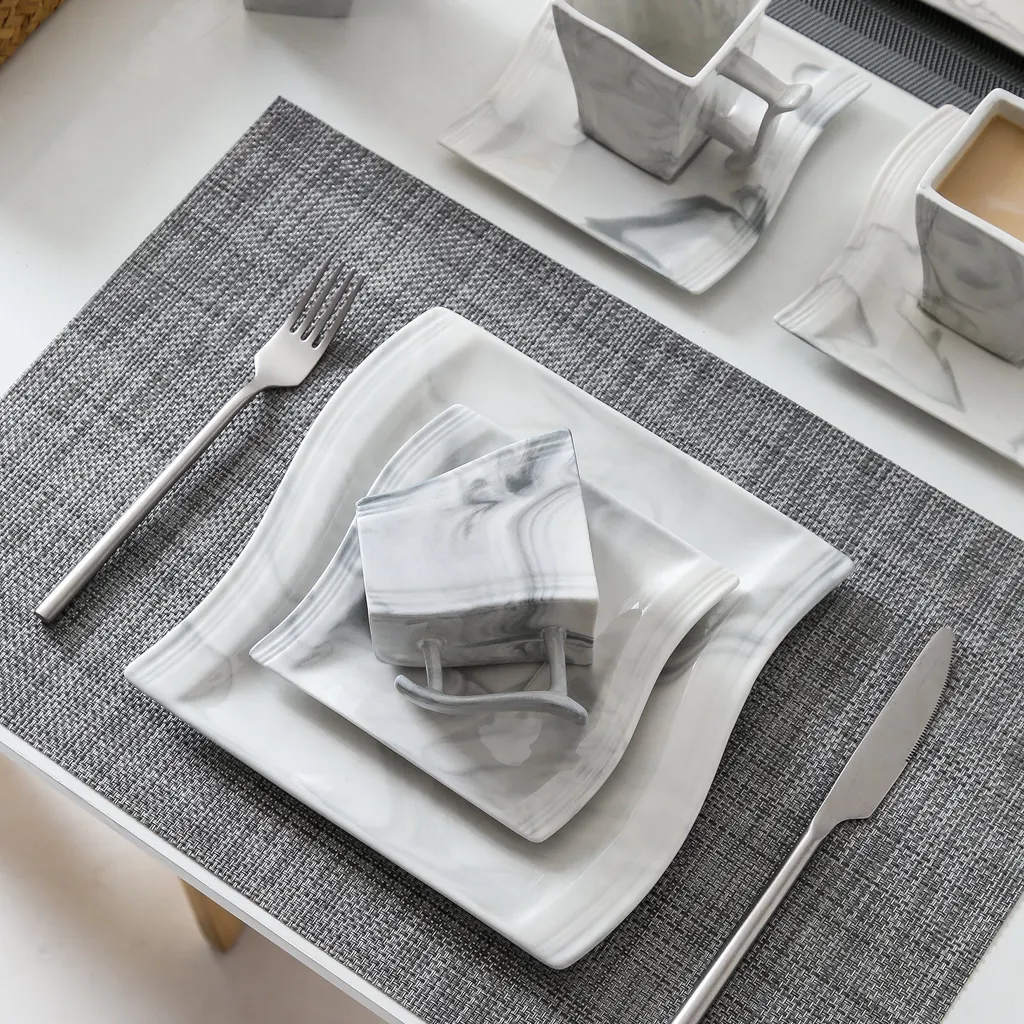 - MIKROWELLEGEIGNET KÜHLSCHRANKSICHER UND SPÜLMASCHINENFEST | Die Qualität von Marmor-Porzellan Geschirrset ist genauso gut wie die cremeweiße Porzellanversion, die ungiftig und harmlos ist. Die gesamte Serie ist sowohl spülmaschinenfest als auch mikrowellengeeignet und dadurch äußerst pflegeleicht. Bitte stellen Sie sicher, dass Ihre Spülmaschine groß genug ist, um das gesamte Geschirr aufzunehmen.