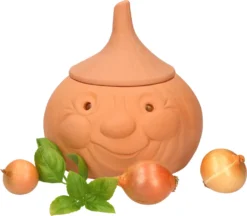 Der super schöne Aufbewahrungsbehälter in witziger Zwiebelform, zaubert nicht nur ein Lächeln ins Gesicht, sondern sorgt vor allem für die optimale Lagerung von Lauch und Knollengemüse. Ca. 900 g fasst das dickwandige Gefäß aus echter Terrakotta und schützt zugleich Ihre Lebensmittel vor Licht und Feuchtigkeit. Durch die eingearbeiteten Öffnungen in den Augen und auf der Rückseite entsteht die ideale Luftzirkulation, die Keimbildung verhindert und Inhalte länger frischhält.