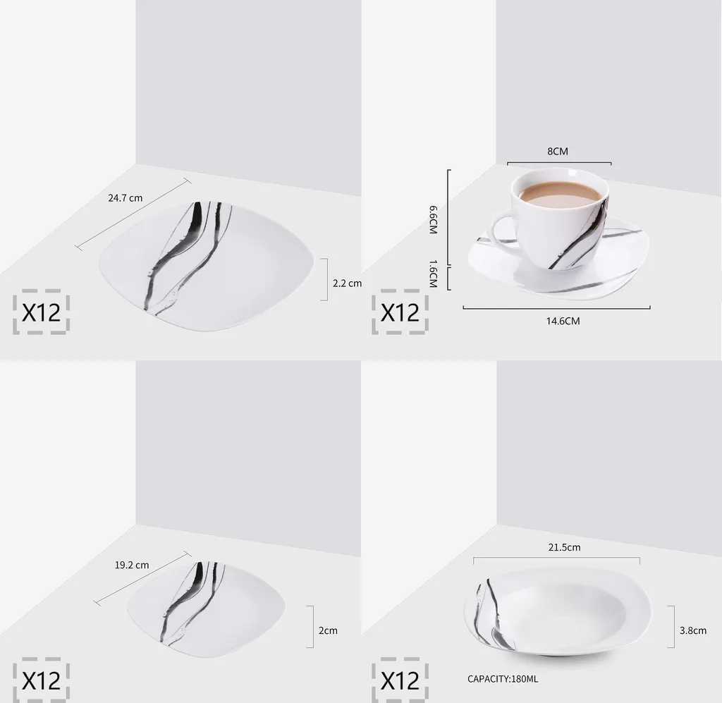 - LIEFERUMFANG – Im Lieferumfang enthalten sind: 12 Kaffeetassen (175 ml, H 6,7 cm), 12 Untertassen (Ø 14,7 cm), 12 Dessertteller (Ø 19,2 cm), 12 Suppenteller (Ø 21,5 cm), 12 Speiseteller (Ø 24,7 cm)